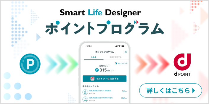 ※スマートライフデザイナーの利用や各種キャンペーンへの参加で獲得できるポイントをdポイントに交換できるサービスです。詳細は関連リンクよりご確認ください。