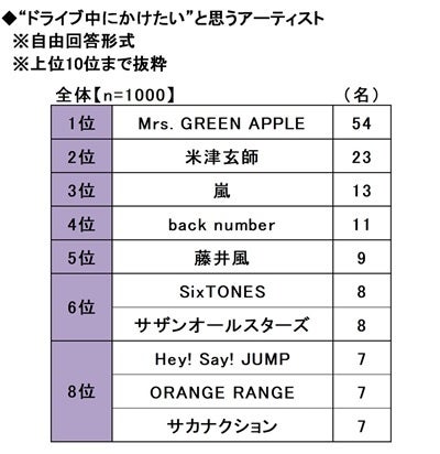 ◆ドライブ中にかけたい音楽 1位「Mrs.  GREEN APPLE」2位「米津玄師さん」3位「嵐」