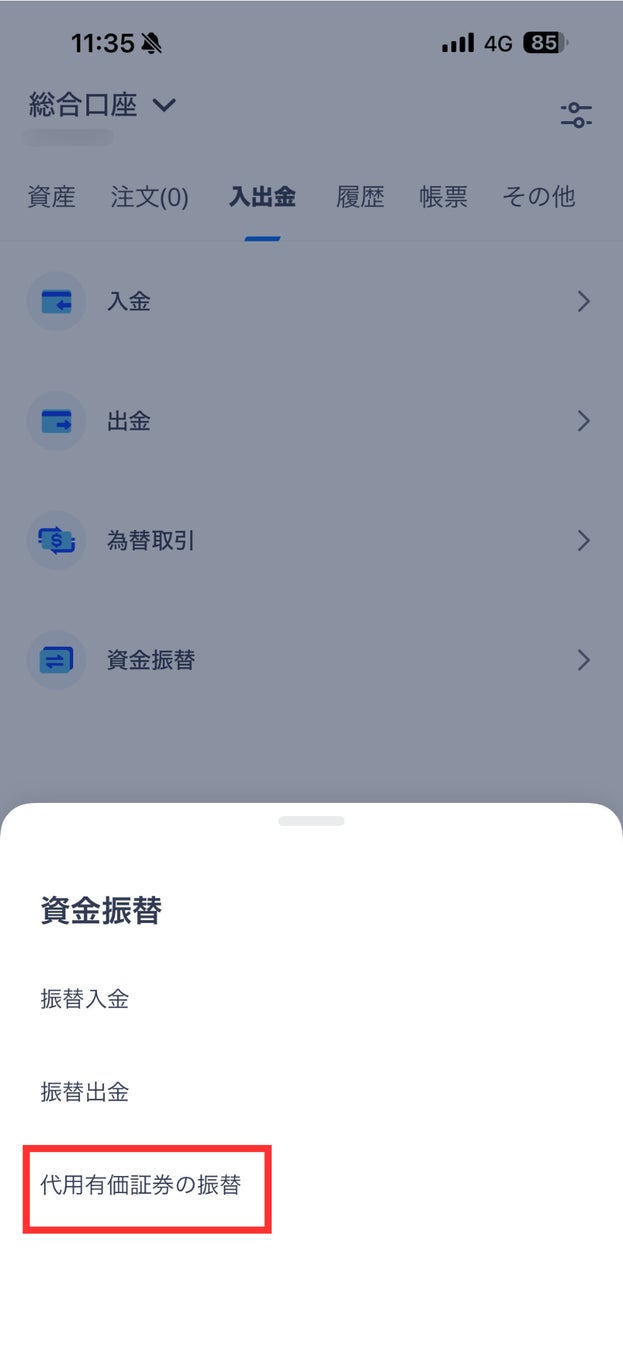 2. 「入出金」>「資金振替」>「代用有価証券の振替」を選択