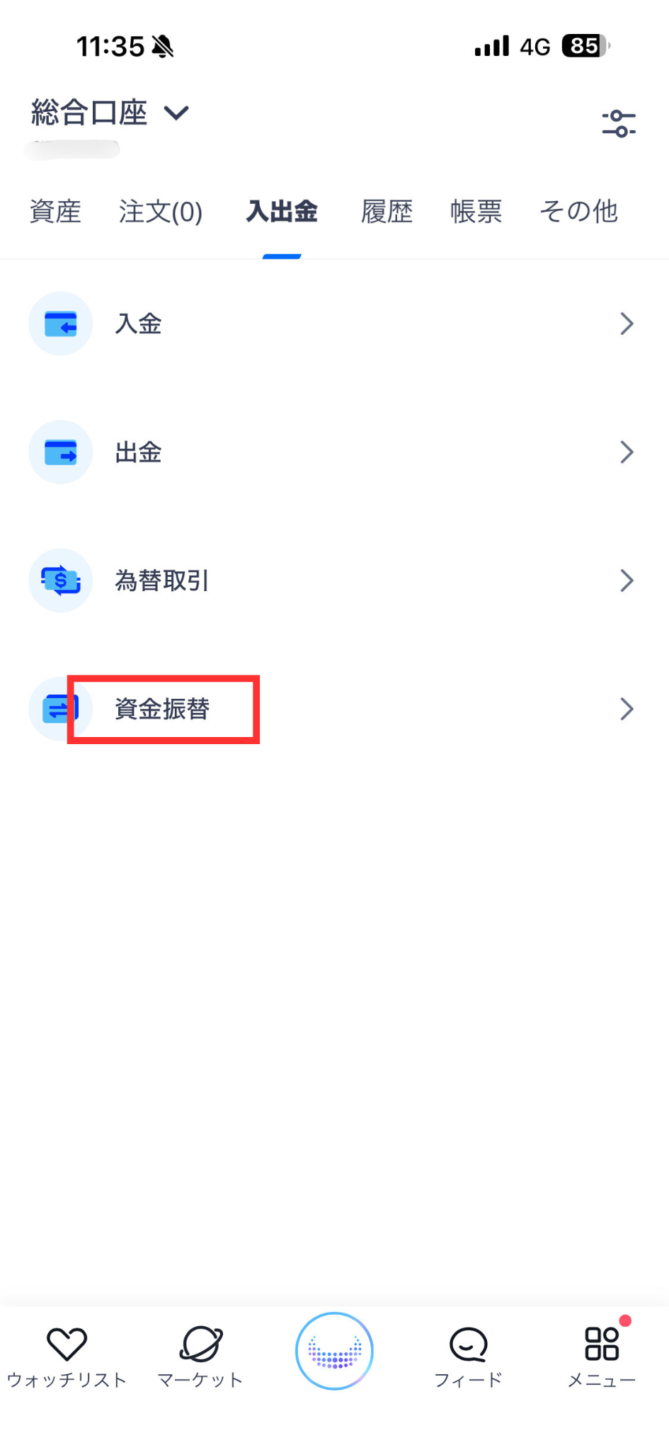 1. Webullロゴ(画面下部中央)をタップし、「総合口座」を開く