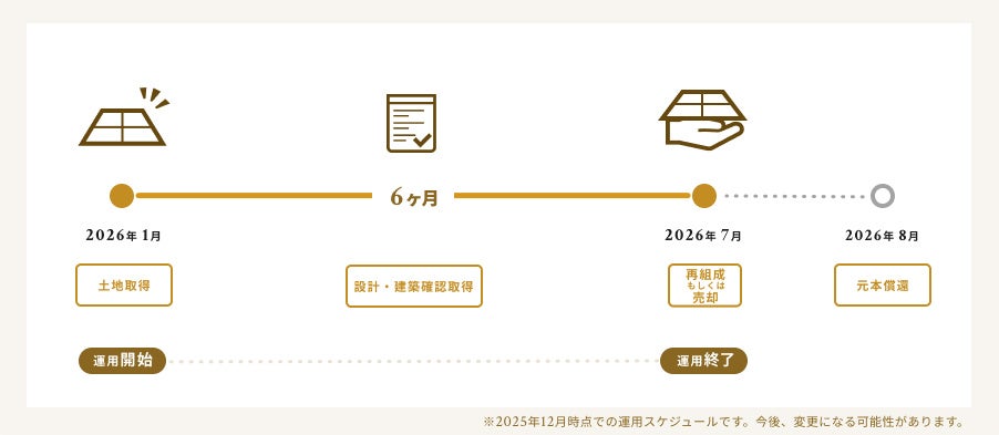 ファンド組成後、複合型ホーム1棟の設計を行い、建築確認を取得、運用終了時には福祉施設用地として、再組成ファンドへ組み入れたうえで、配当金支払および元本償還を行います。