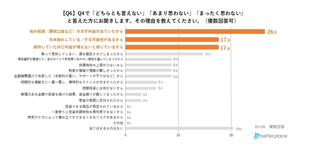 NISAを利用して良かったと思わない・どちらとも言えないと感じる理由は「他の投資(課税口座など)の方が利益が出ていたから」が最多の26.5%となり、「元本割れしている/する可能性があるから」「期待していたほど利益が増えないと感じているから」はそれぞれ17.6%となりました。