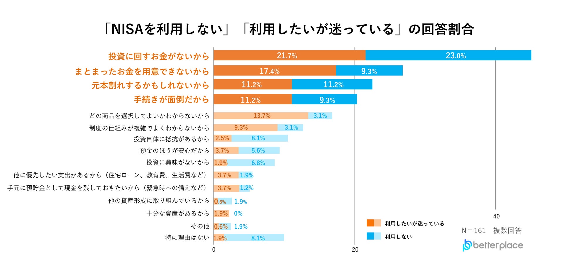 NISAを利用しない、または迷っている人に理由を聞いたところ、「投資に回すお金がないから」が最多の44.7%となりました。次いで「まとまったお金を用意できないから」が26.7%、「元本割れするかもしれないから」が22.4%、「手続きが面倒だから」が20.5%と続きました。