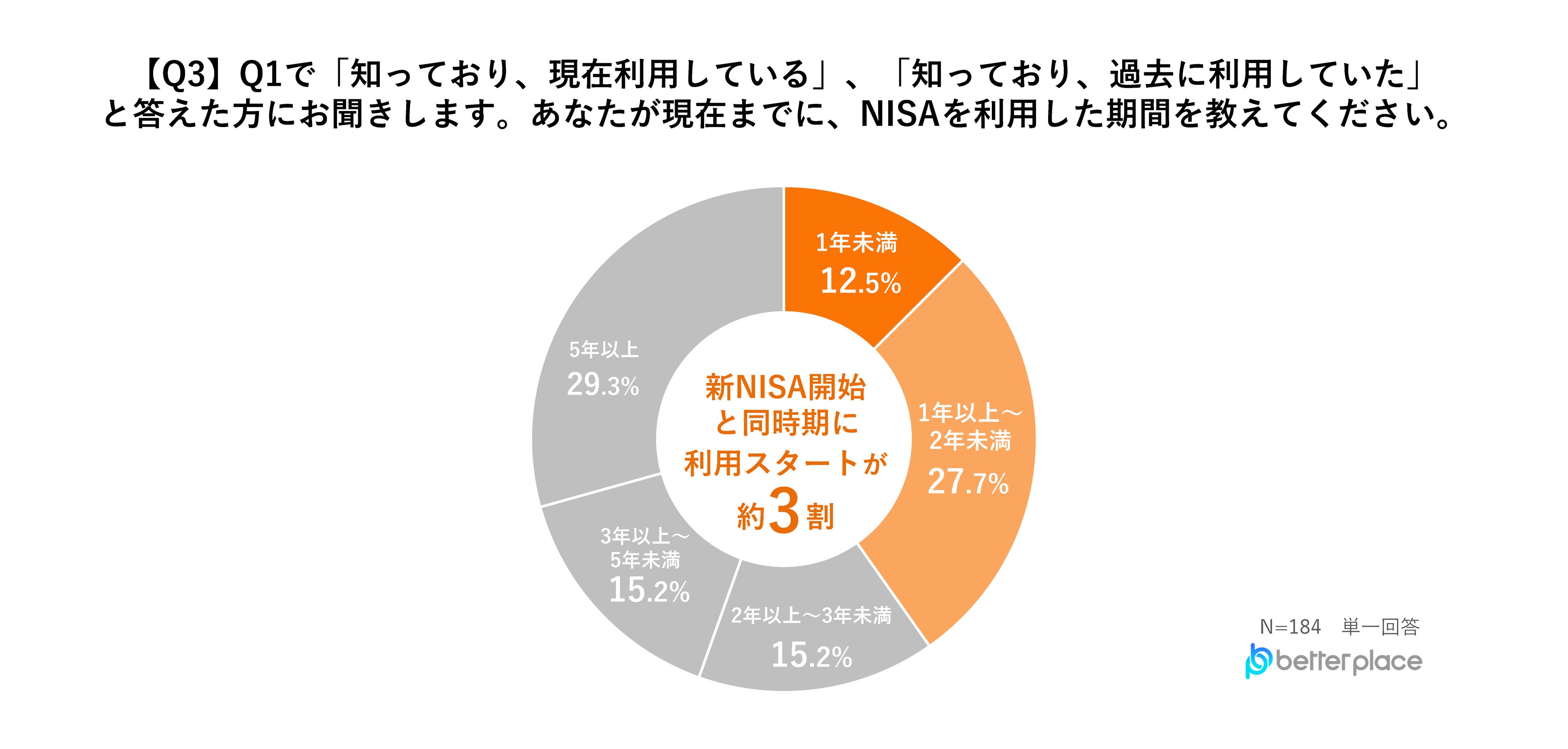 【Q3】Q1で「知っており、現在利用している」、「知っており、過去に利用していた」と答えた方にお聞きします。あなたが現在までに、NISAを利用した期間を教えてください。