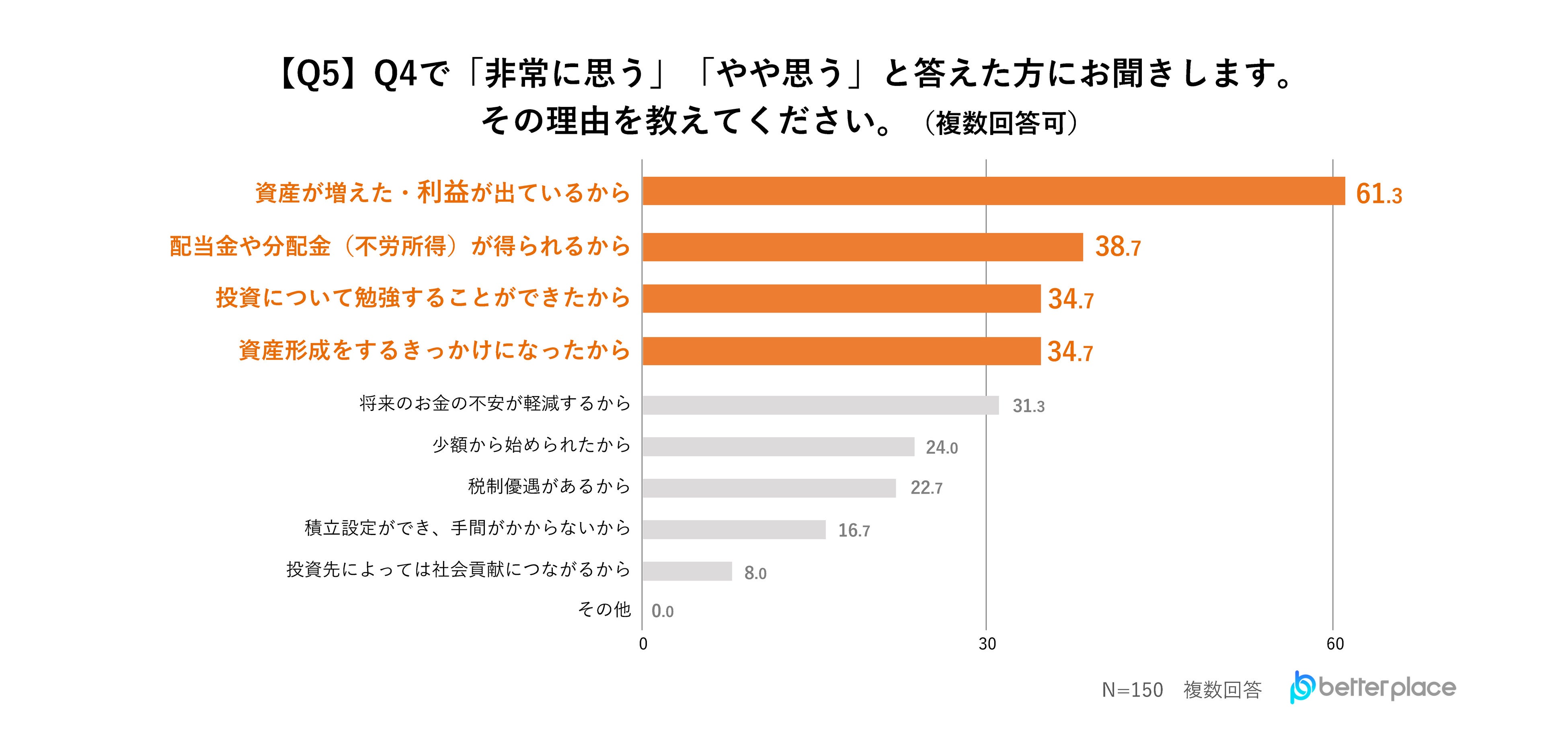 NISAを利用して良かったと思う人の理由は、「資産が増えた・利益が出ているから」が最多の61.3%、次いで「配当金や分配金(不労所得)が得られるから」が38.7%、「投資について勉強することができたから」「資産形成をするきっかけになったから」が34.7%と続く結果になりました。