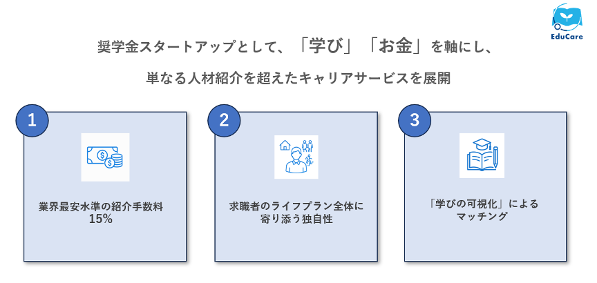 EduCareは、これまで教育ローンや奨学金支援を通じて「学ぶ人」の経済的課題に向き合ってきました。こうした背景から、奨学金返済という経済的課題と、キャリア形成という成長課題を同時に解決するため人材紹介事業を立ち上げました。