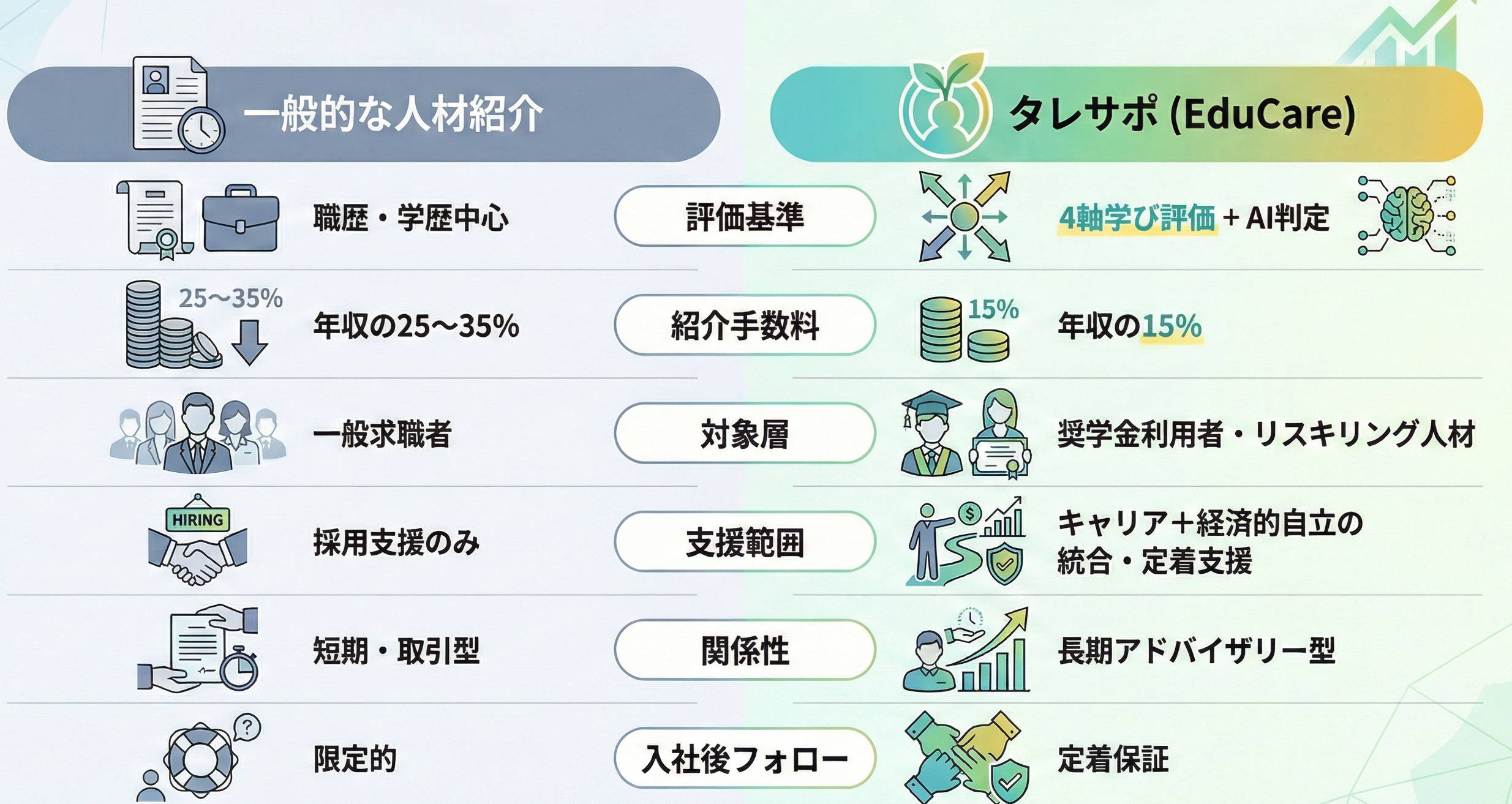 「学ぶ人のための、新しい金融機関」を目指す株式会社EduCare(本社:東京都中央区、代表取締役:村上健太、以下「当社」)は、有料職業紹介事業許可(許可番号:13-ユ-316073)を取得し、2026年1月5日より、「学び」を中心に据えた人材紹介サービス「タレサポ」の提供を開始いたしましたので、お知らせいたします。