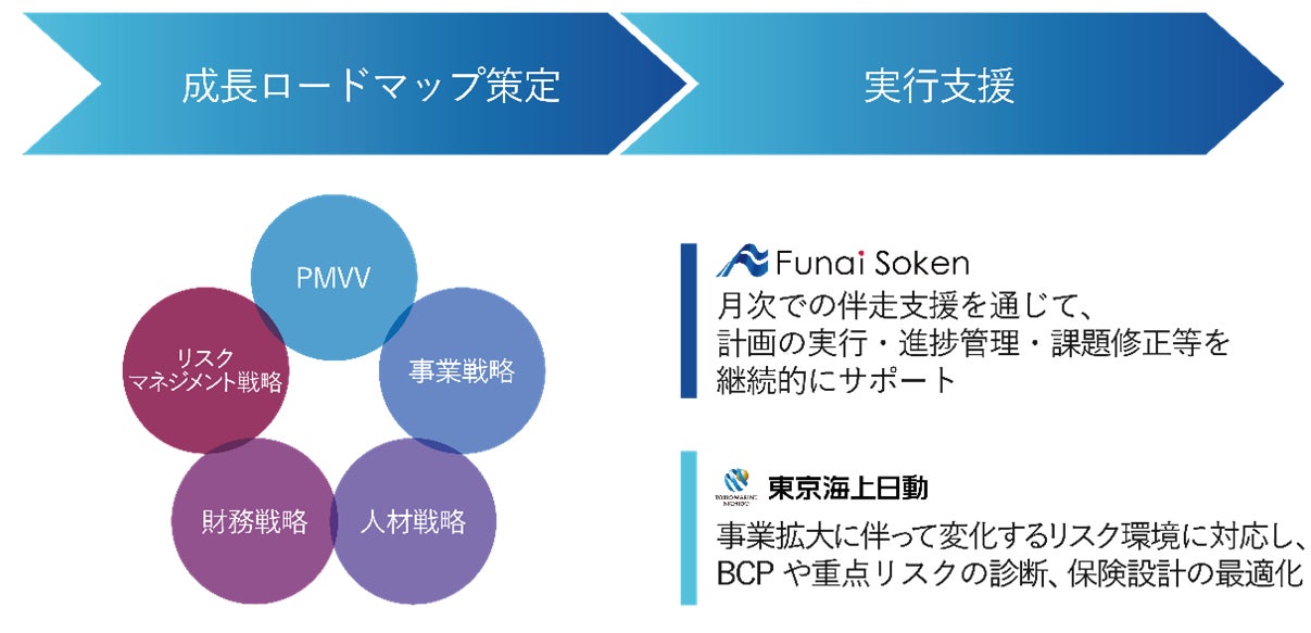 ロードマップの策定後は、船井総合研究所が月次単位で取り組み状況を可視化し、必要な戦略・施策の立案を伴走支援することで、計画の着実な実行を継続的にサポートします。東京海上日動は、事業戦略、財務戦略の遂行に伴って発生する新たなリスクに対する最適な保険の設計やリスクマネジメントの構築等を支援し、企業のめざす姿への挑戦に貢献します。
