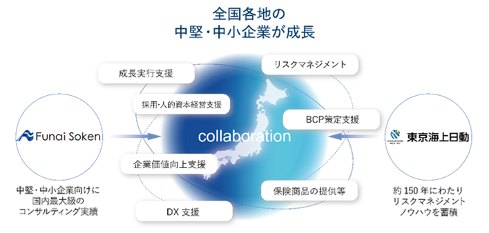 東京海上日動と船井総合研究所は、それぞれ異なる視点から企業の課題を捉え、成長機会の創出とリスクへの対応を一体で伴走支援することで、大企業と比較してリソースの限られる中堅・中小企業の持続的な成長を支援できると考え、本連携に至りました。