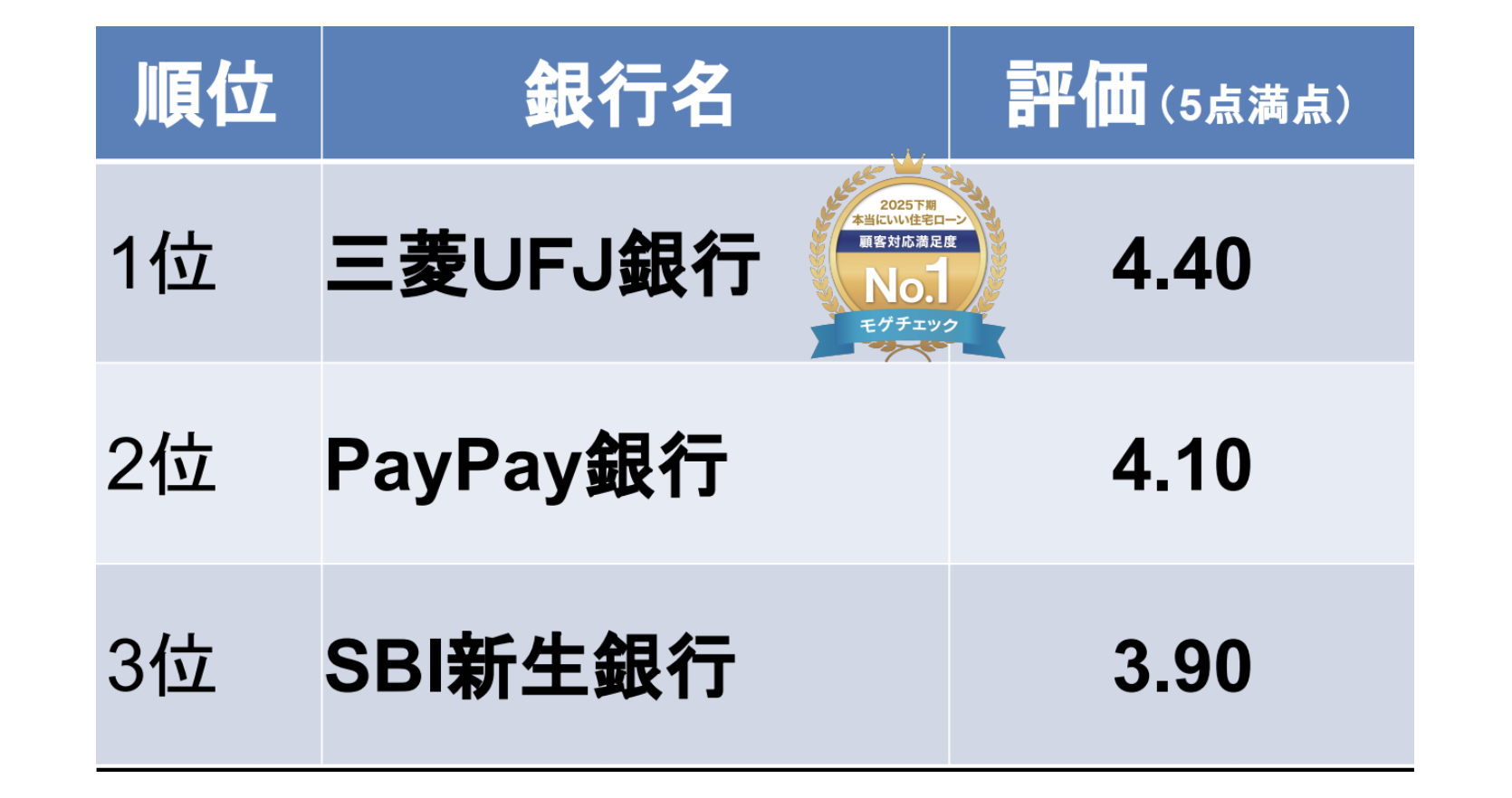 顧客対応満足度ランキングでは、三菱UFJ銀行が1位を獲得しました。 「対応が迅速かつ的確」「手厚く、分かりやすく、返信も早かった」といった声が数多く寄せられ、メガバンクならではの質の高いサポート体制が評価されました。不安の多い住宅ローン契約において、迅速かつ丁寧なコミュニケーションがユーザーの大きな信頼に繋がっています。