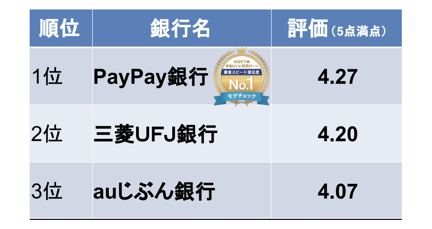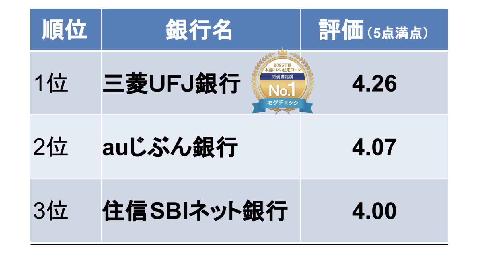 2位は三菱UFJ銀行です。 「事前審査が早い」という点に加え、メガバンクならではの「担当制」による手厚いフォローが光りました。3位にはauじぶん銀行がランクイン。 「ネットで完結する」という利便性がスピード感に直結しており、多くのユーザーから支持を集める結果となりました。