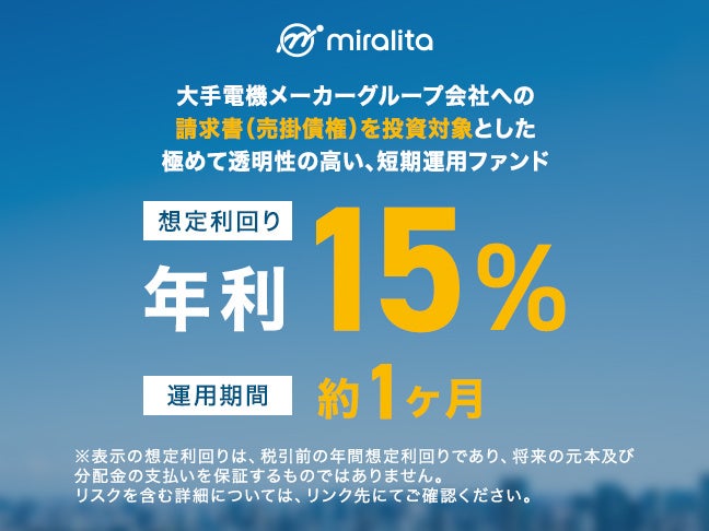 事業投資型クラウドファンディングプラットフォーム「ミラリタ」を運営するミラリタ株式会社(本社:東京都港区/代表取締役社長:重田恭宏)は、第3号ファンド「大手電機メーカーグループ会社向け売掛債権買取ファンド(以下「本ファンド」という。)」の情報を公開しました。