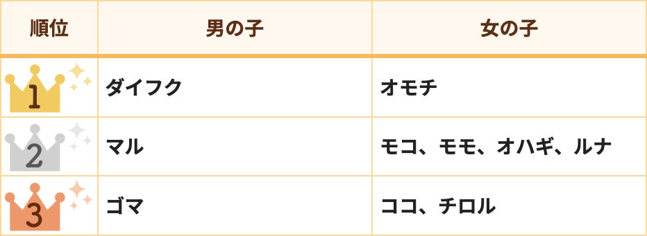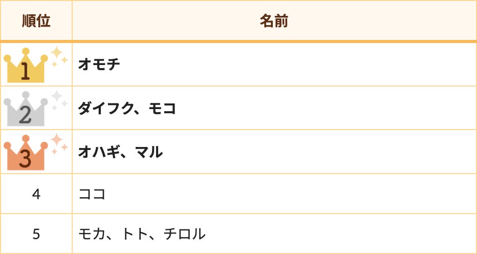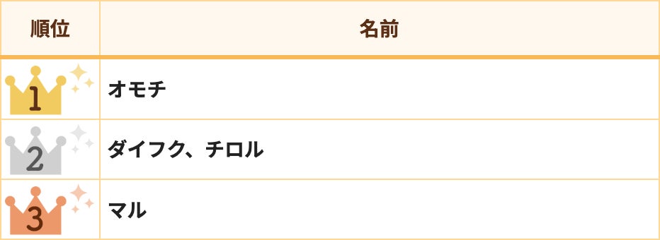 2位は「ダイフク」「チロル」、3位は「マル」と白くて丸い姿を連想させる「和菓子系」が上位を占めました。