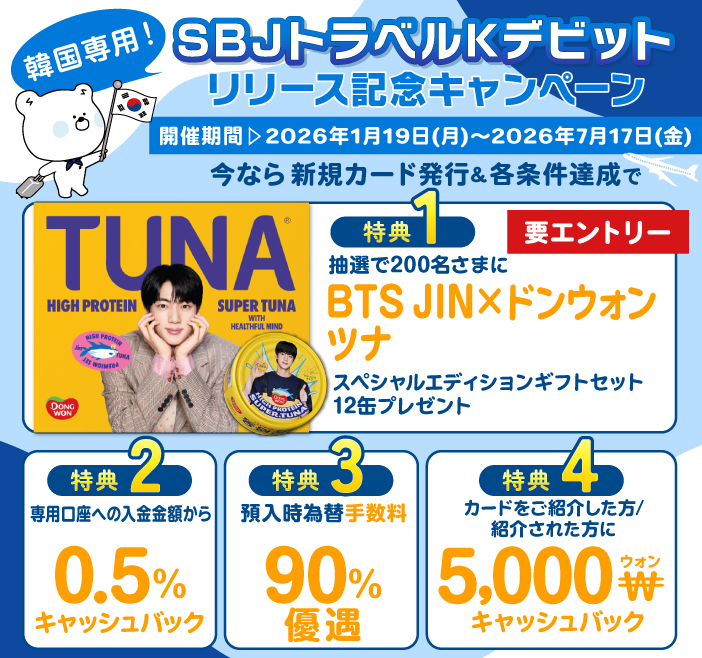 株式会社SBJ銀行(本店:東京都港区、代表取締役社長:並木 稔「以下、当行」)は、2026年1月19日(月)より、「SBJトラベルKデビット」をリリースいたします。また、併せまして、本商品のリリースを記念して、リリース記念キャンペーンを実施いたします。本キャンペーンは、各種手数料の優遇やキャッシュバック、抽選で200名様にBTS JINの関連商品をプレゼントする大変お得な内容となっておりますので、この機会にぜひ当行とのお取引をご検討ください。