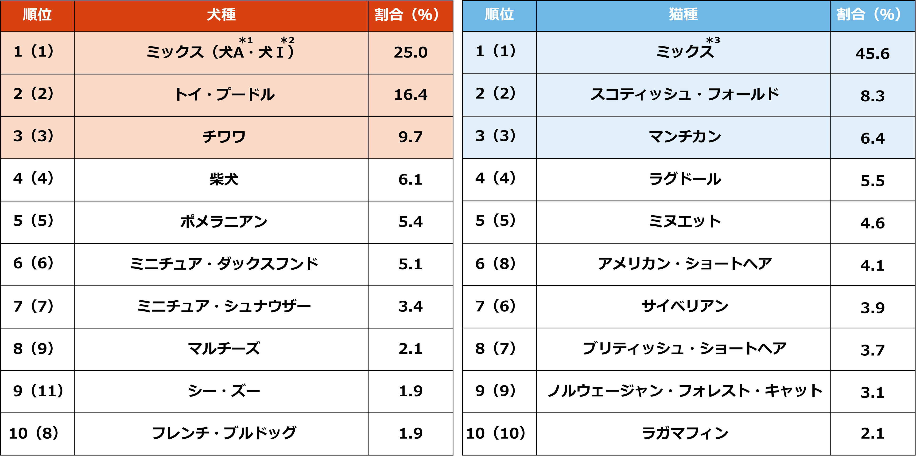 ◆(犬)(猫)「ミックス」が昨年同様1位、(犬)「シー・ズー」が2年ぶりにトップ10入り