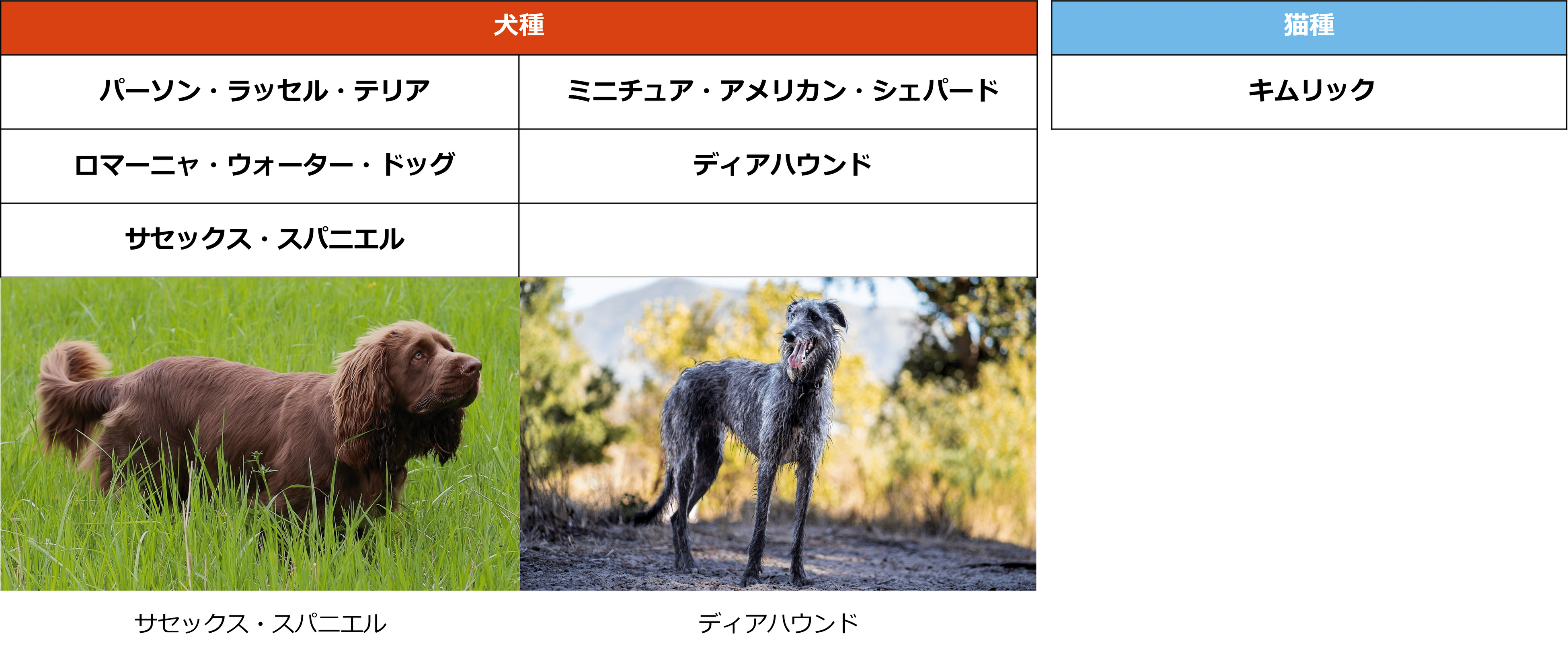 過去6年間*⁶で初めてアイペットの保険に加入いただいた珍しい犬種と猫種をご紹介します。犬は、学習力があり、水が好きな「サセックス・スパニエル」などの5種、猫は、尻尾がない、あるいは短いのが特徴の「キムリック」が登場しました。