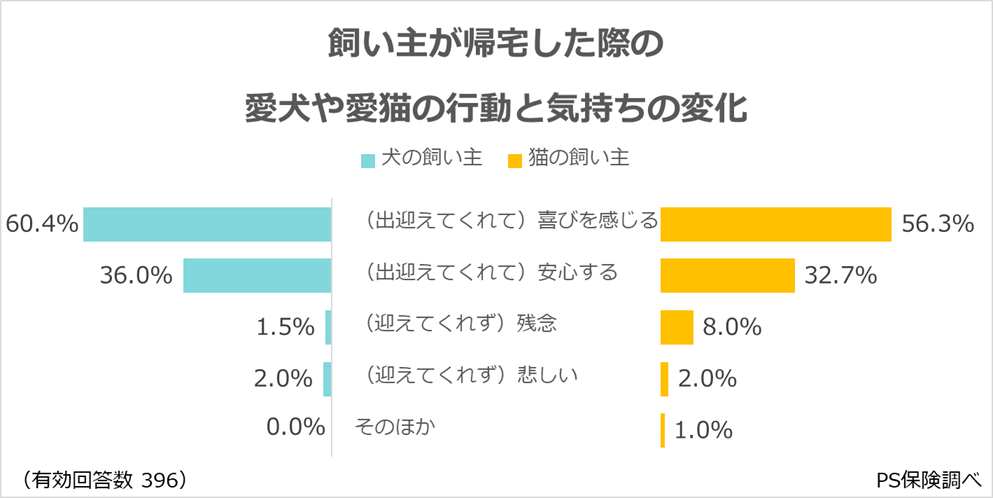 ・「(出迎えてくれて)喜びを感じる」が最多(犬の飼い主:60.4%、猫の飼い主:56.3%)。