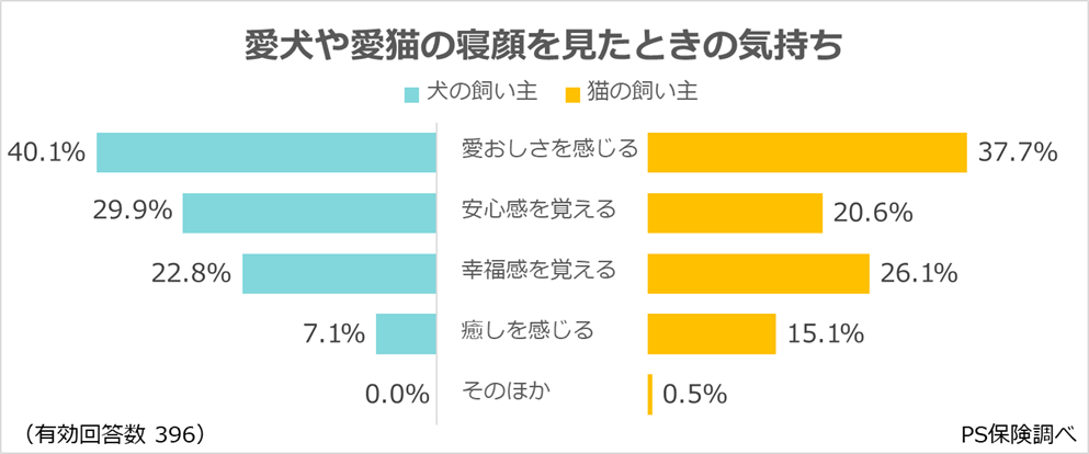 また、「安心感を覚える」(20.6%)や「癒しを感じる」(15.1%)も挙げられ、愛猫の寝顔が飼い主の心を穏やかにしている様子がうかがえます。犬の飼い主より「癒しを感じる」を挙げる割合がやや高く、静かな寝顔が飼い主に落ち着きをもたらしていると考えられます。