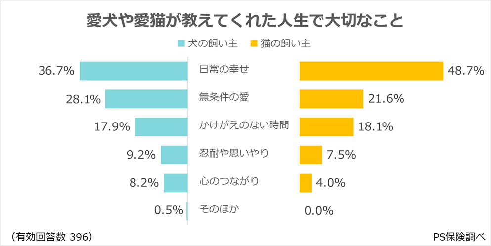 ・「日常の幸せ」(犬:36.7%、猫:48.7%)が最多。
