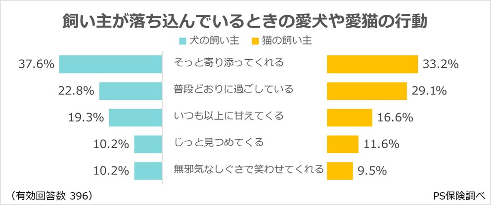 ・「そっと寄り添ってくれる」(犬の飼い主:37.6%、猫の飼い主:33.2%)。