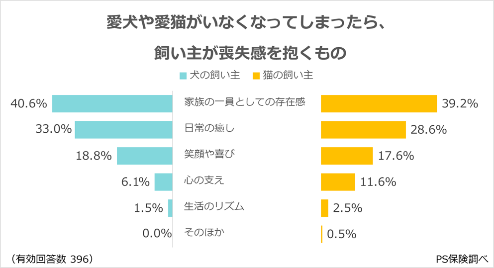 ・犬の飼い主は、「日常の癒し」を、猫の飼い主は、「心の支え」をより失うと回答。