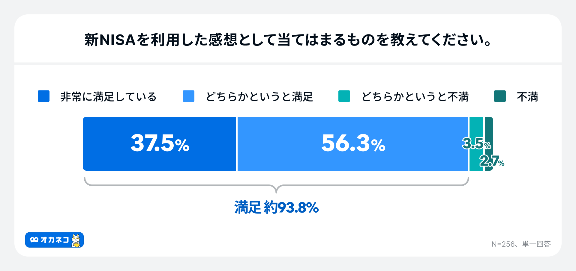 新NISA開始から現在までの運用成績を尋ねたところ、「大きなプラス(+20%超)」44.9%、「プラス(+1%〜20%以下)」45.3%となり、合計90.2%が利益が出ている状態であることが分かりました。この成功体験を背景に、利用者の93.8%が制度利用に対して「満足」(「非常に満足している」37.5%、「どちらかというと満足」56.3%)と回答しています。