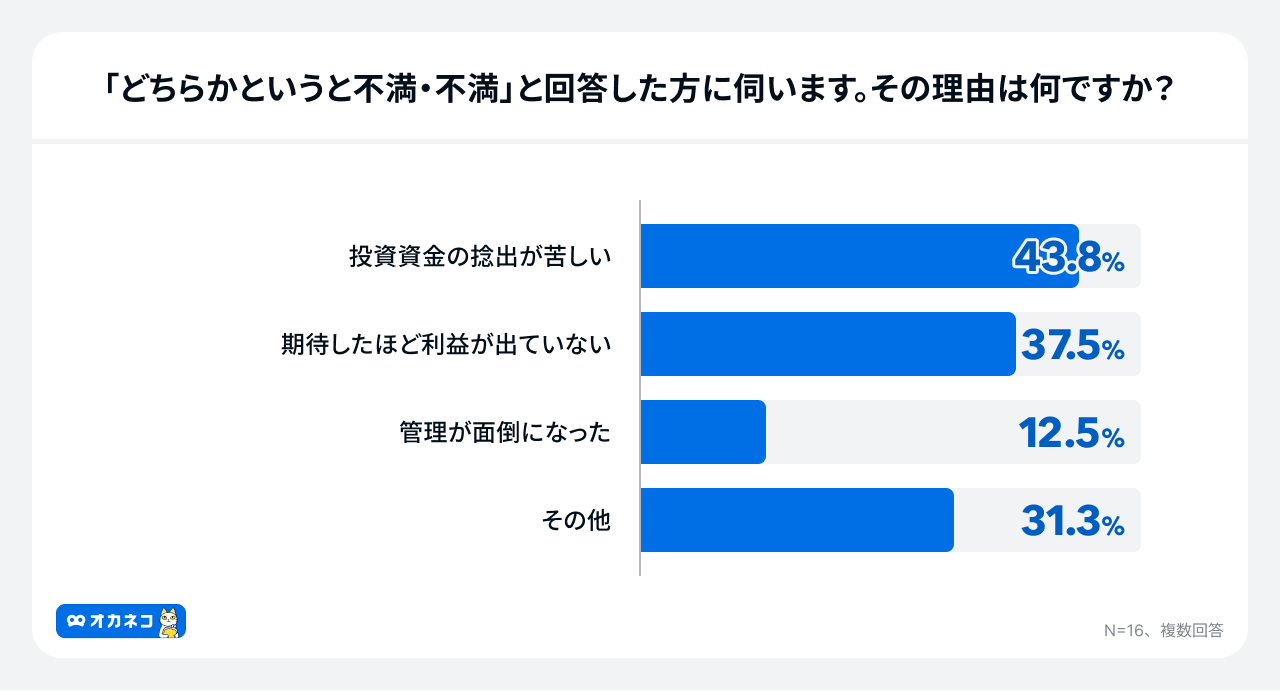 一方で、一部の不満層(計6.3%:内訳は「どちらかというと不満」3.5%、「不満」2.7%)に理由を尋ねたところ、「期待したほど利益が出ていない」37.5%を抑え、「投資資金の捻出が苦しい」43.8%が最多となりました。昨今の物価高騰が家計を圧迫しているからか、投資資金の確保が個人の継続性を左右する満足度の重要な変数となっている実態が浮き彫りになりました。