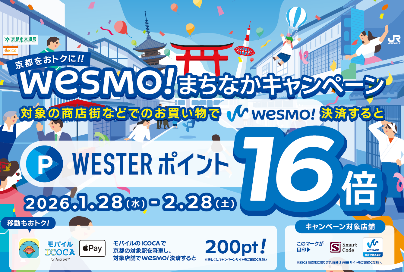 西日本旅客鉄道株式会社(本社:大阪府大阪市、代表取締役社長:倉坂昇治)と合同会社KICS(事務局:京都府下京区、代表社員 納屋町商店街振興組合 職務執行者:小林 満、以下「KICS」)、株式会社ジェーシービー(本社:東京都港区、代表取締役会長兼執行役員社長:二重孝好、以下「JCB」)は、JR西日本のスマホ決済アプリ『Wesmo!』のキャンペーンとしまして、Wesmo!のご利用でWESTERポイント(基本)が通常の16倍(8%)即時還元とおトクになる「京都をおトクに!! Wesmo!まちなかキャンペーン」を2026年1月28日(水)~2月28日(土)まで開催します。