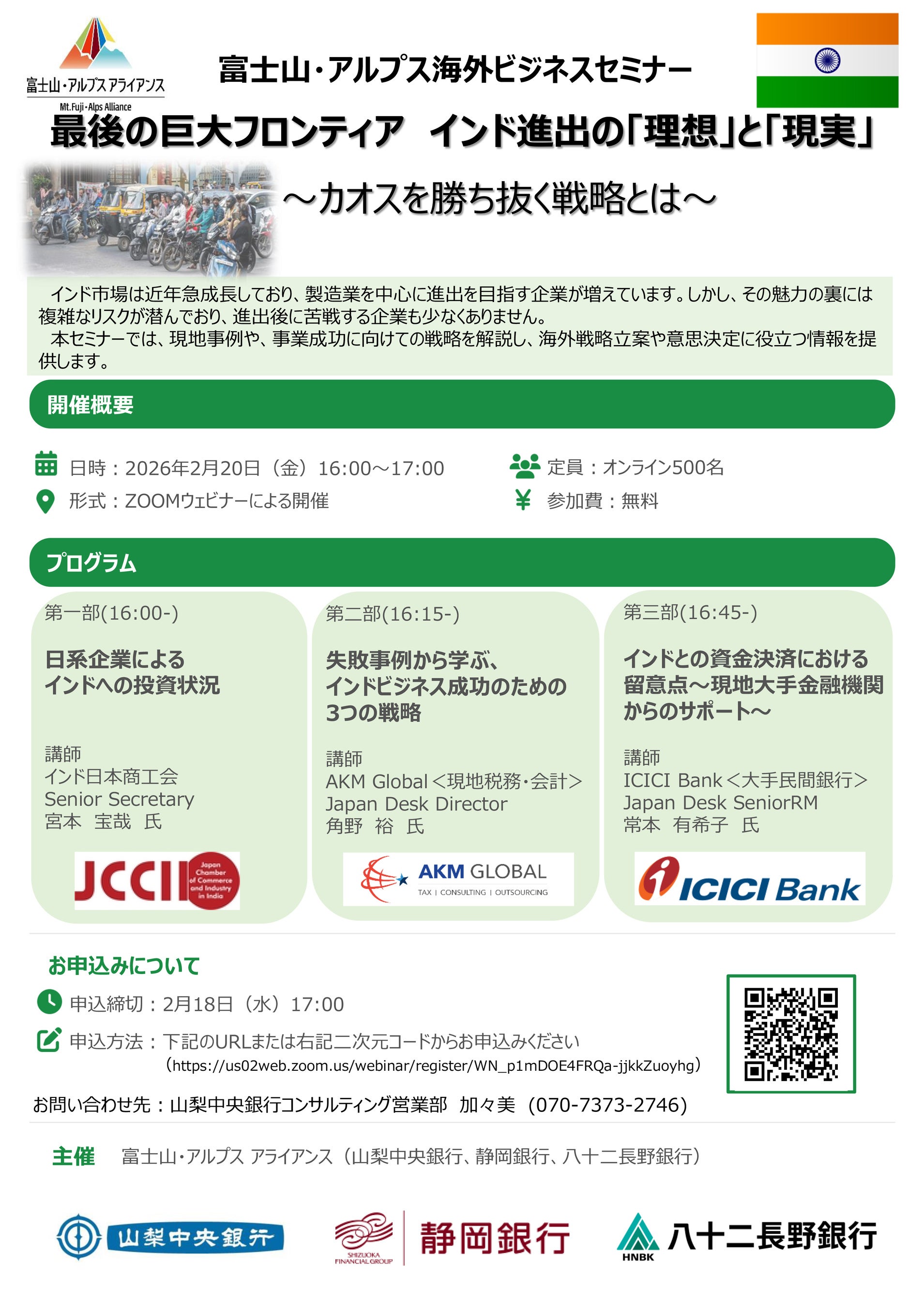 株式会社山梨中央銀行(頭取 古屋 賀章)、株式会社静岡銀行(頭取 八木 稔)、株式会社八十二長野銀行(頭取 松下 正樹)は、お取引先のインドでの事業展開サポートを目的に、足元の日系進出動向や現地事例、成功のための戦略を紹介する「富士山・アルプス海外ビジネスセミナー」を開催します。