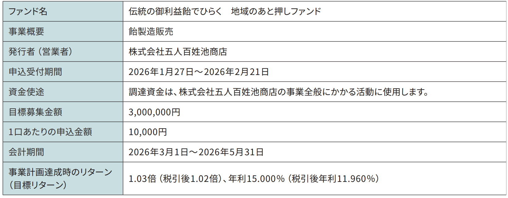 1245年創業の老舗飴屋の挑戦!持続可能なまちづくりを目指す五人百姓池商店を応援 投資型クラウドファンディング「Sony Bank GATE」新規ファンド募集(1月27日募集開始)