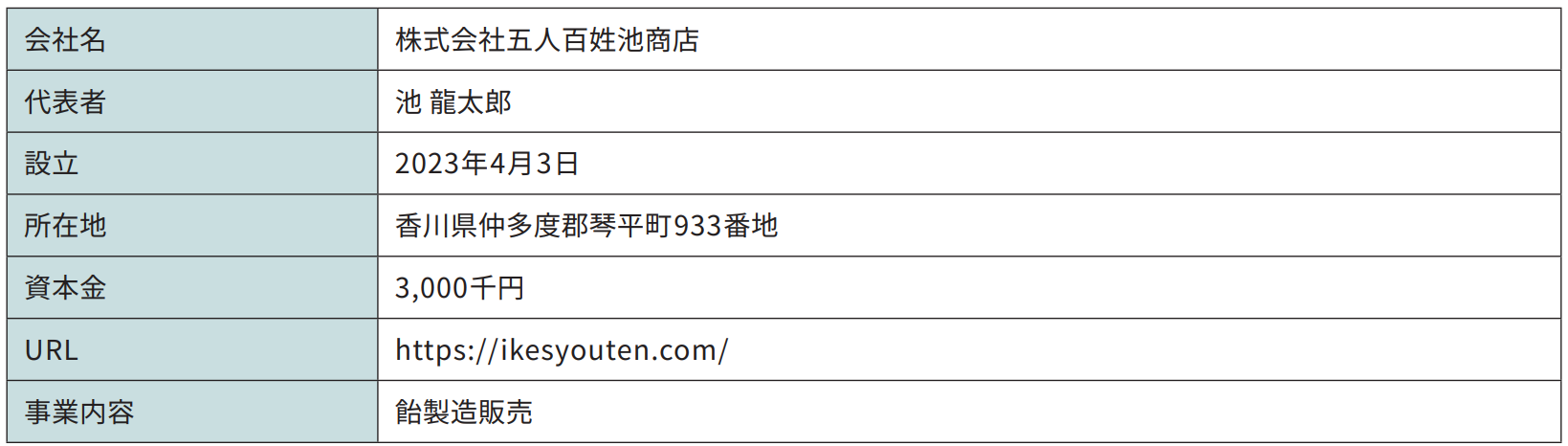 1245年(寛元3年)、香川県琴平町の金刀比羅宮の境内(参道)にて創業した「五人百姓池商店」(以下 同社)は、「こんぴらさん」の名で親しまれるこの地で、780年以上にわたり伝統のご利益飴「加美代飴(かみよあめ)」の製造・販売を続けています。五人百姓とは、1,000年超の歴史をもつといわれる金刀比羅宮が琴平町に来る際、お供してきた5つの家系のことであり、神事の手伝いを続けながら、今も参拝者向けに飴を作り続けている5軒の飴屋を指します。その家系のひとつが同社です。