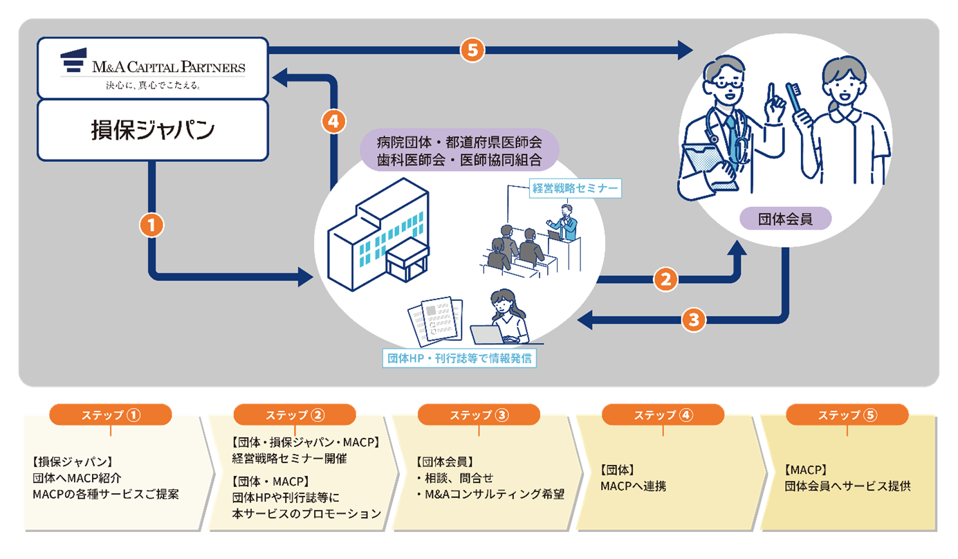 損保ジャパンと取引実績のある病院団体、都道府県医師会・歯科医師会・医師協同組合等の各団体へMACPを紹介し、MACPが会員向けに医業承継コンサルティングに関する各種サービスを提供します。
