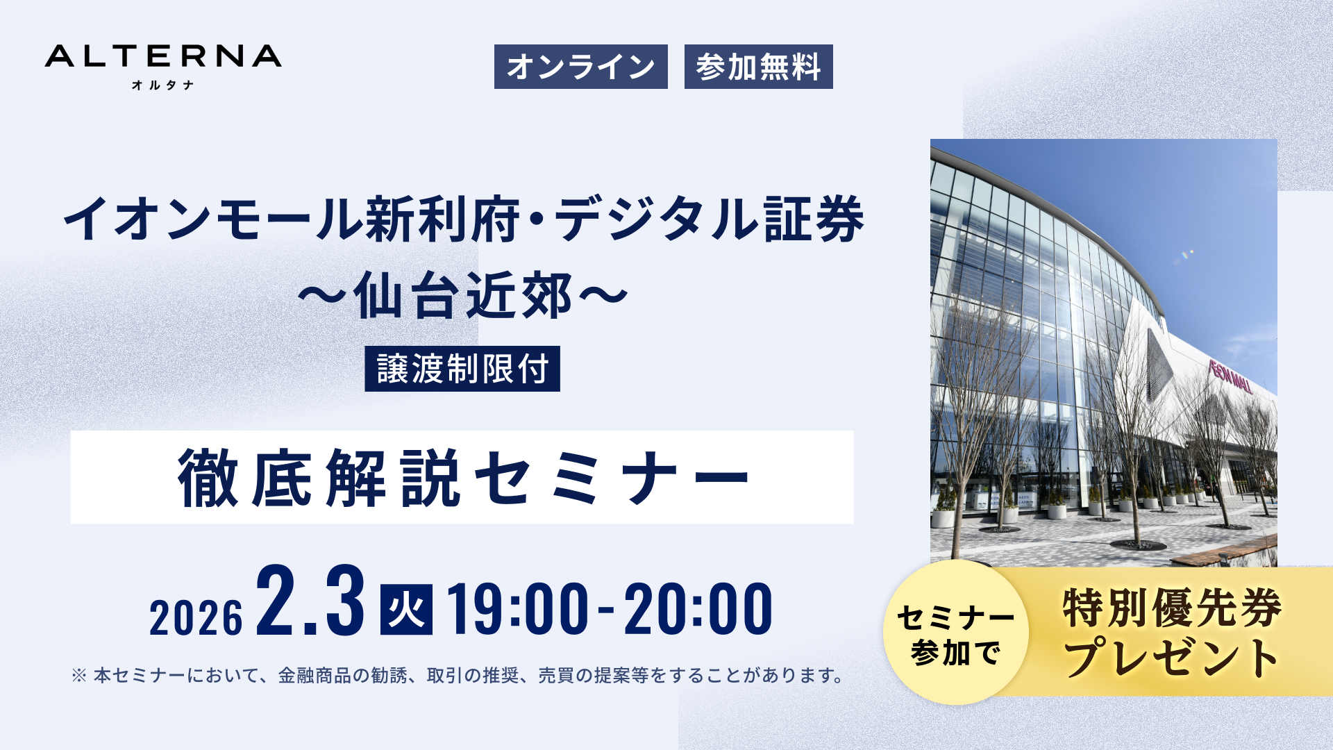 「イオンモール新利府・デジタル証券〜仙台近郊~(譲渡制限付)」徹底解説セミナーを開催(2/3)