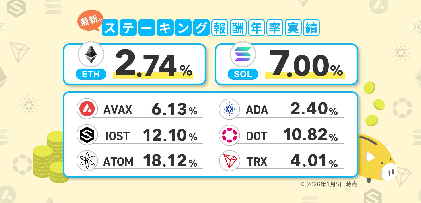 手数料無料で、国内最高の報酬年率※4にて提供しているため、当社ステーキングサービスをご利用いただくことで、お客様の暗号資産を効率的に増やすことができます!