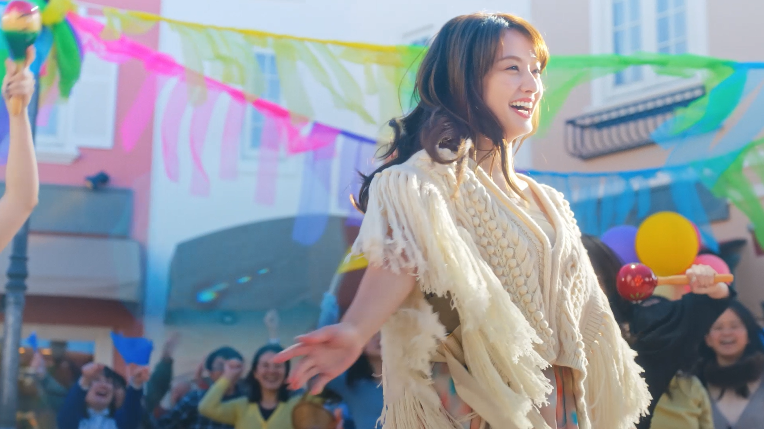 本CMでは、ラテンテイストのオリジナル楽曲にあわせ、フェスの雰囲気をモチーフにしたカラフルな街を舞台に展開します。谷まりあさんは、色鮮やかなロングスカートに大ぶりのフリンジが印象的な衣装を着用し、ダンスシーンが映えるカジュアルな装いで登場。エネルギッシュで耳に残るラテンテイストのオリジナル楽曲にあわせ、フェスを楽しむ大勢の人々の真ん中で、マラカスを手にリズムに乗り、ダンサーやエキストラが一体となって、躍動感あふれるダンスを披露します。