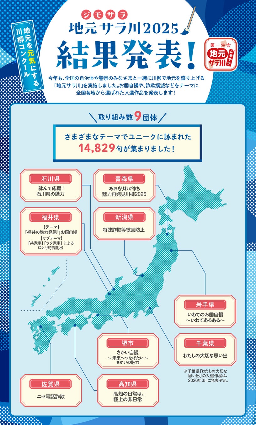 第一生命保険株式会社(代表取締役社長:隅野 俊亮)では、2025年に開催の『サラっと一句!わたしの川柳コンクール(サラ川)』と共に、地方創生の一環としてご当地版川柳コンクールの『地元サラ川』を実施しました。