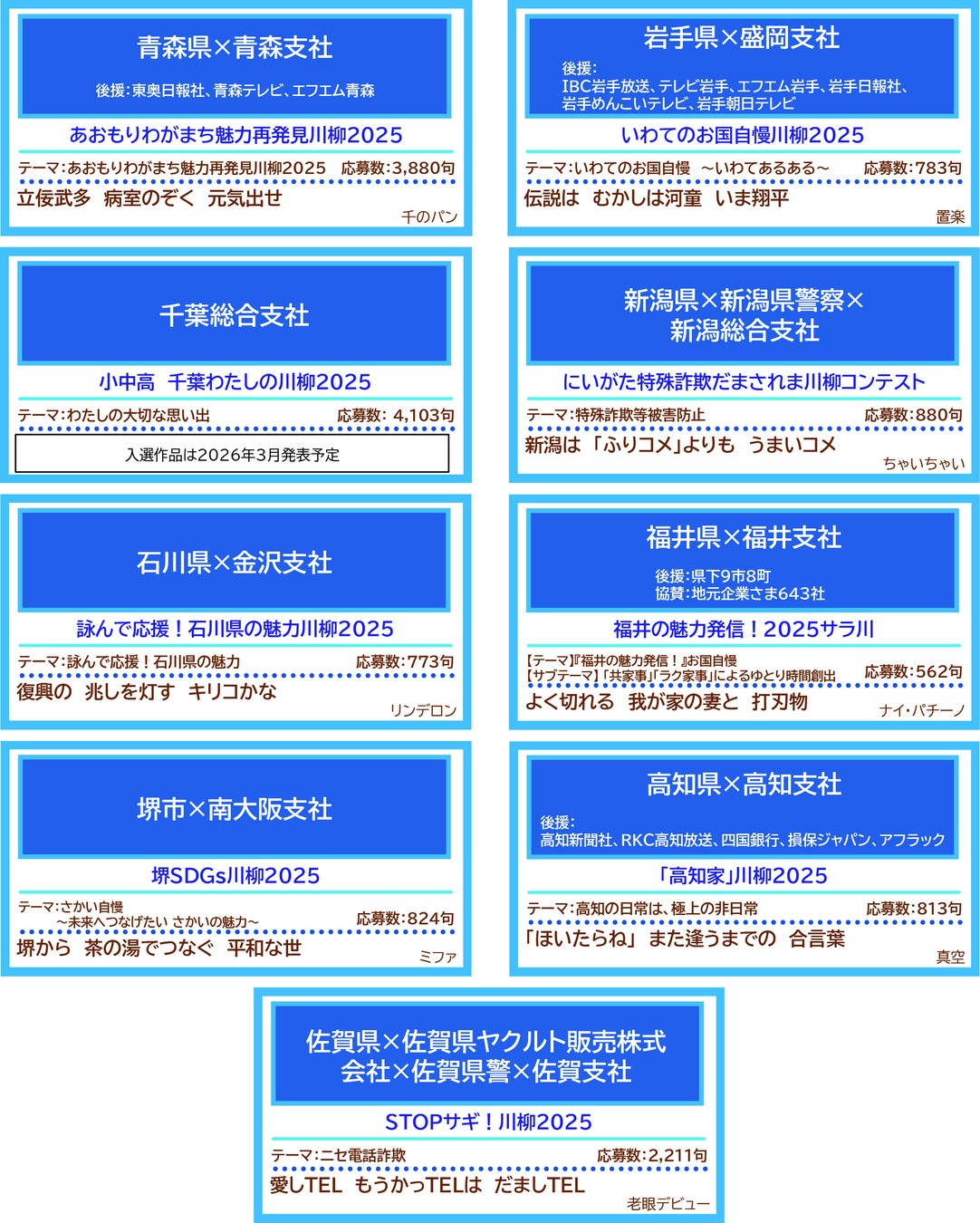 2025年は、全国の自治体や警察など9団体に参加いただき、14,829句の作品が集まりました。地元の魅力で詠む「お国自慢」をはじめ、詐欺撲滅をテーマにした作品など、全国各地からユーモアあふれる川柳が多数寄せられました。