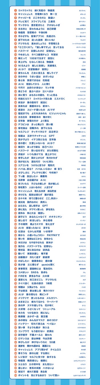 大阪・関西万博の公式キャラクターとして人気者となったミャクミャクや、初の女性総理大臣が誕生した自民党総裁選、SNSでバズった楽曲のワンフレーズなど、2025年ならではの語句を巧みに使って身近な出来事を詠んだ句も優秀100句にランクインしました。