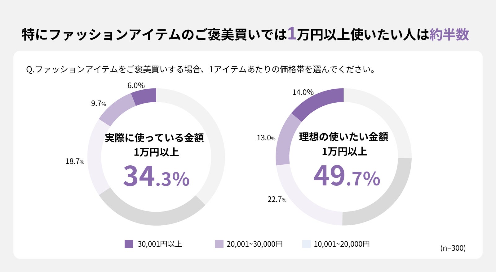 ご褒美買いの対象として「ファッションアイテム」を選んだ人を対象に、実際に使っている金額と理想の金額をたずねたところ、実際に1万円以上を使っている人は全体の34.3%に留まりましたが、理想の支出額として1万円以上を挙げた人は49.7%と、現実と理想のギャップが生じていることが明らかになりました。