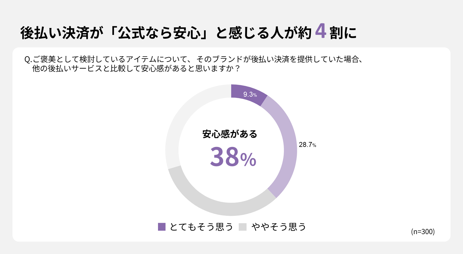 同じく、ファッションアイテムをご褒美買いの対象に選んだ人に公式が提供する金融サービスの利用意向について聞いたところ、公式が後払いサービスを提供する場合38%が「一般的なサービスより安心感がある」と評価。さらに、全体の34.7%、特に30代の男女では46%が利用することに好意的な反応を示しました。