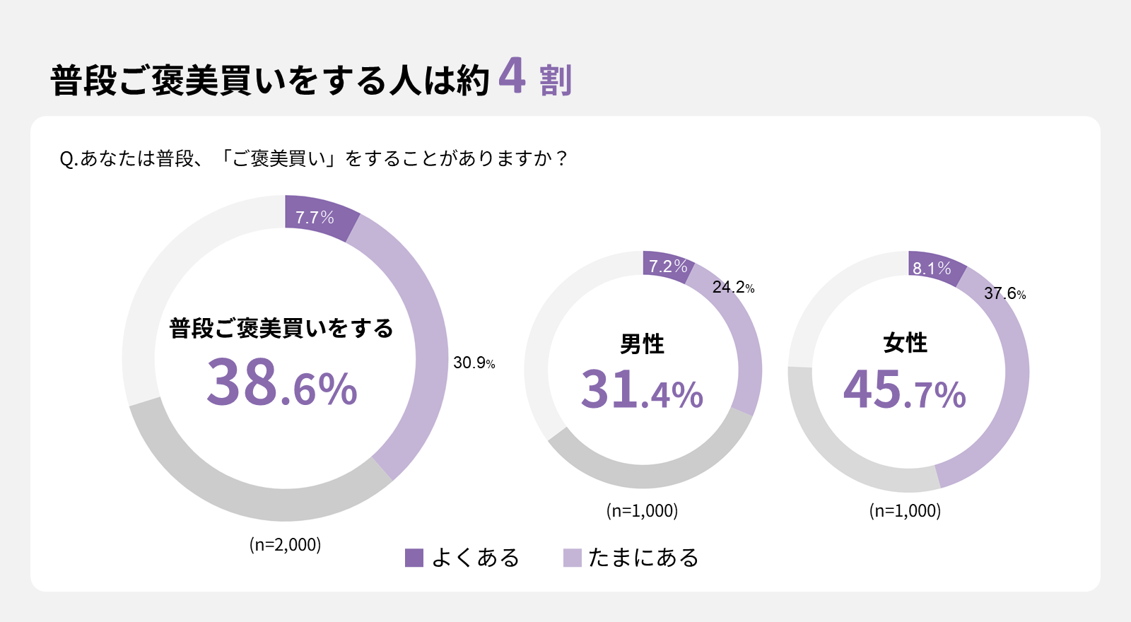ご褒美買いをすることが「よくある」「たまにある」と回答した人は全体で38.6%でした。男性は31.4%、女性は45.7%であり、女性の方がご褒美買いをする傾向があることがわかりました。