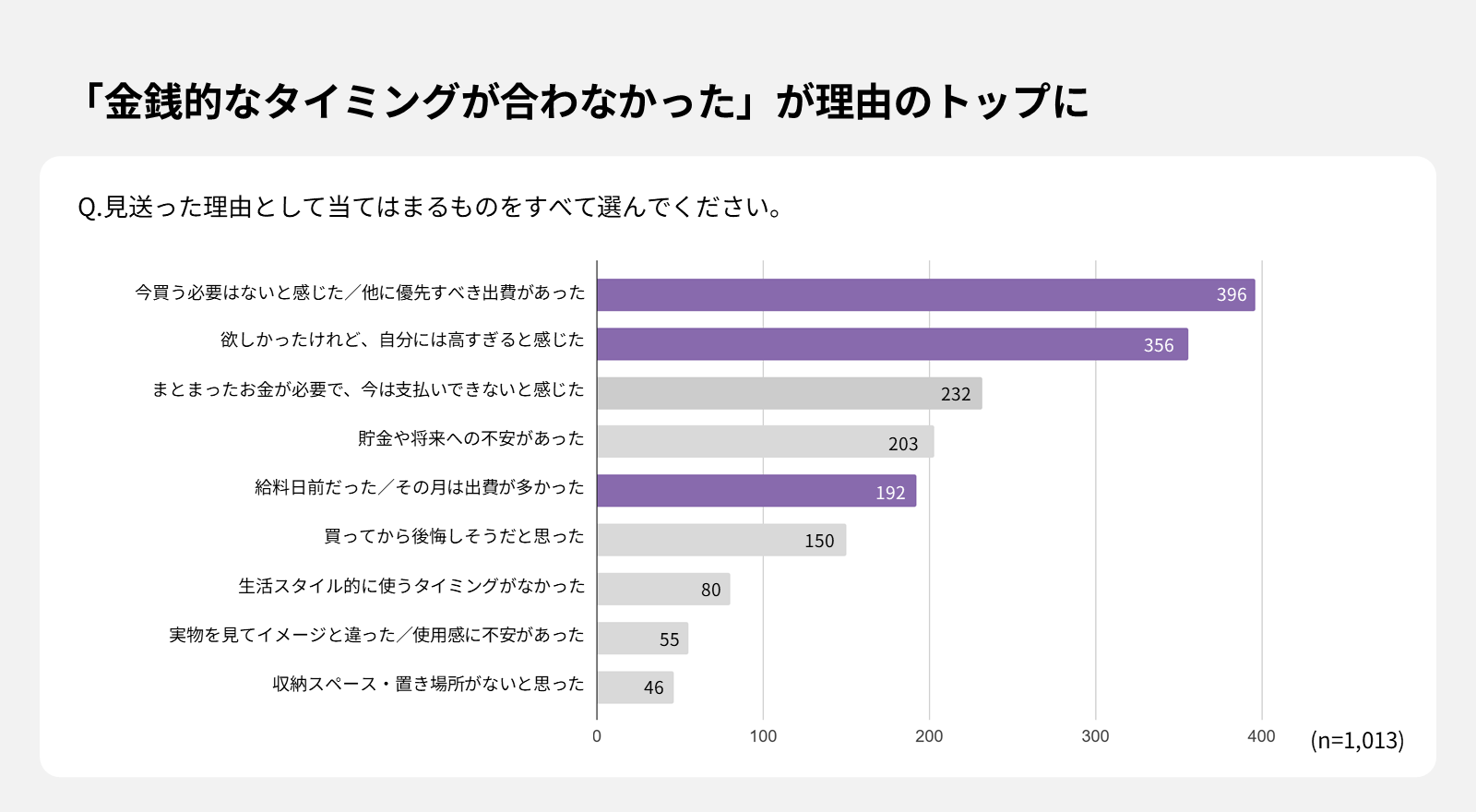 見送り理由は「他に優先すべき出費があった」「今は支払いできないと感じた」などが上位となり、欲しい気持ちと金銭的なタイミングが合わず購買に至らなかった“未成立のご褒美”が、日常に少なからず存在していることが考えられます。