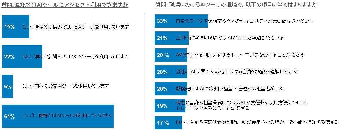 さらに、職場においてデータ保護のセキュリティ対策が優先事項とされていると感じる人は33%、責任あるAI使用のトレーニングを受けられる人は20%、上長・経営陣からAI活用を奨励されている人は21%にとどまっており、体制整備・認知・教育のいずれにも改善余地が見られます。