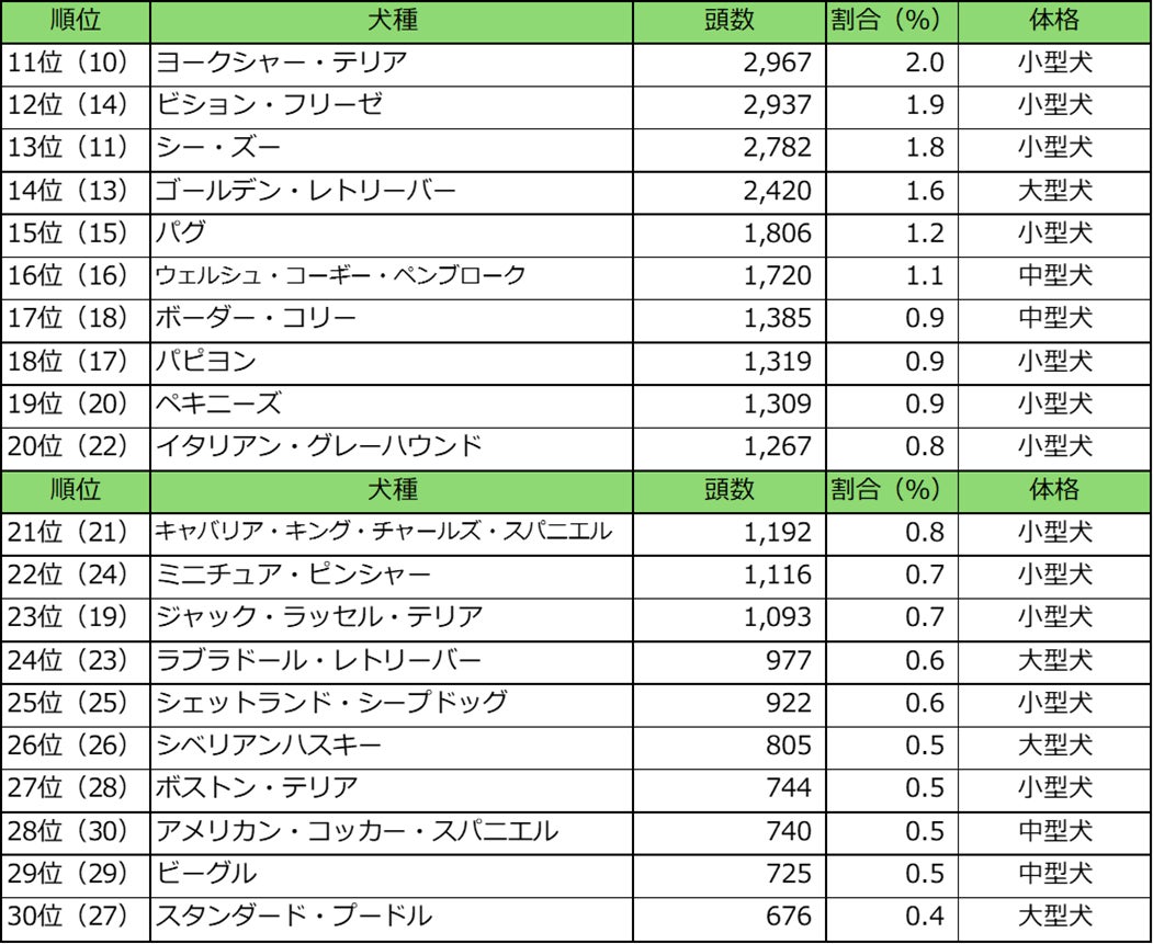 「ヨークシャー・テリア(11位、2,967頭)」や「ビション・フリーゼ(12位、2,937頭)」、「シー・ズー(13位、2,782頭)」など、小型犬が続いています。