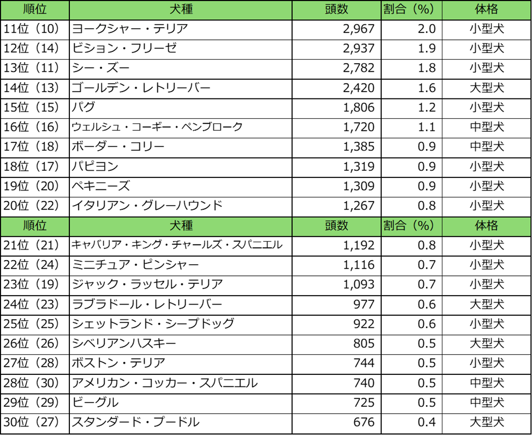 「ヨークシャー・テリア(11位、2,967頭)」や「ビション・フリーゼ(12位、2,937頭)」、「シー・ズー(13位、2,782頭)」など、小型犬が続いています。