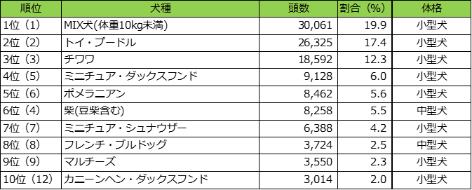 上位では小型犬が中心となる一方、中型犬・大型犬も一定数ランクインしており、体格の選択肢は幅広く保たれていることが分かります。