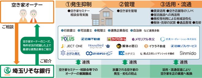 「空き家まるごと解決システム」は、埼玉りそな銀行が連携協定を締結している埼玉県内の専門企業16社の紹介を通じ、管理、売却、賃貸、解体、リフォーム、遺品整理、地域活性化等の空き家に関する多様なこまりごとの解決をサポートするサービスで、2025年9月より提供しています。