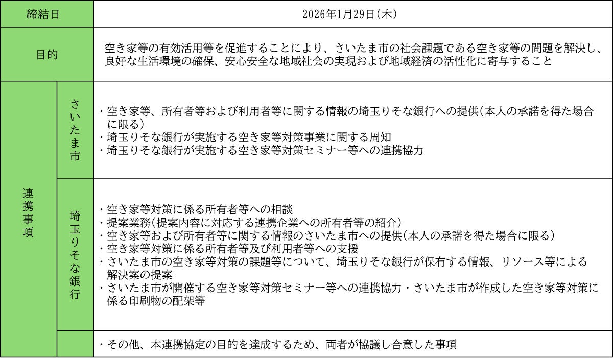 りそなグループの埼玉りそな銀行(社長 福岡 聡)は、「空き家まるごと解決システム」の活用を通じてさいたま市における空き家のこまりごとを解決するため、さいたま市(市長 清水 勇人)と「空き家等対策の推進に関する連携協定」を本日締結しました。