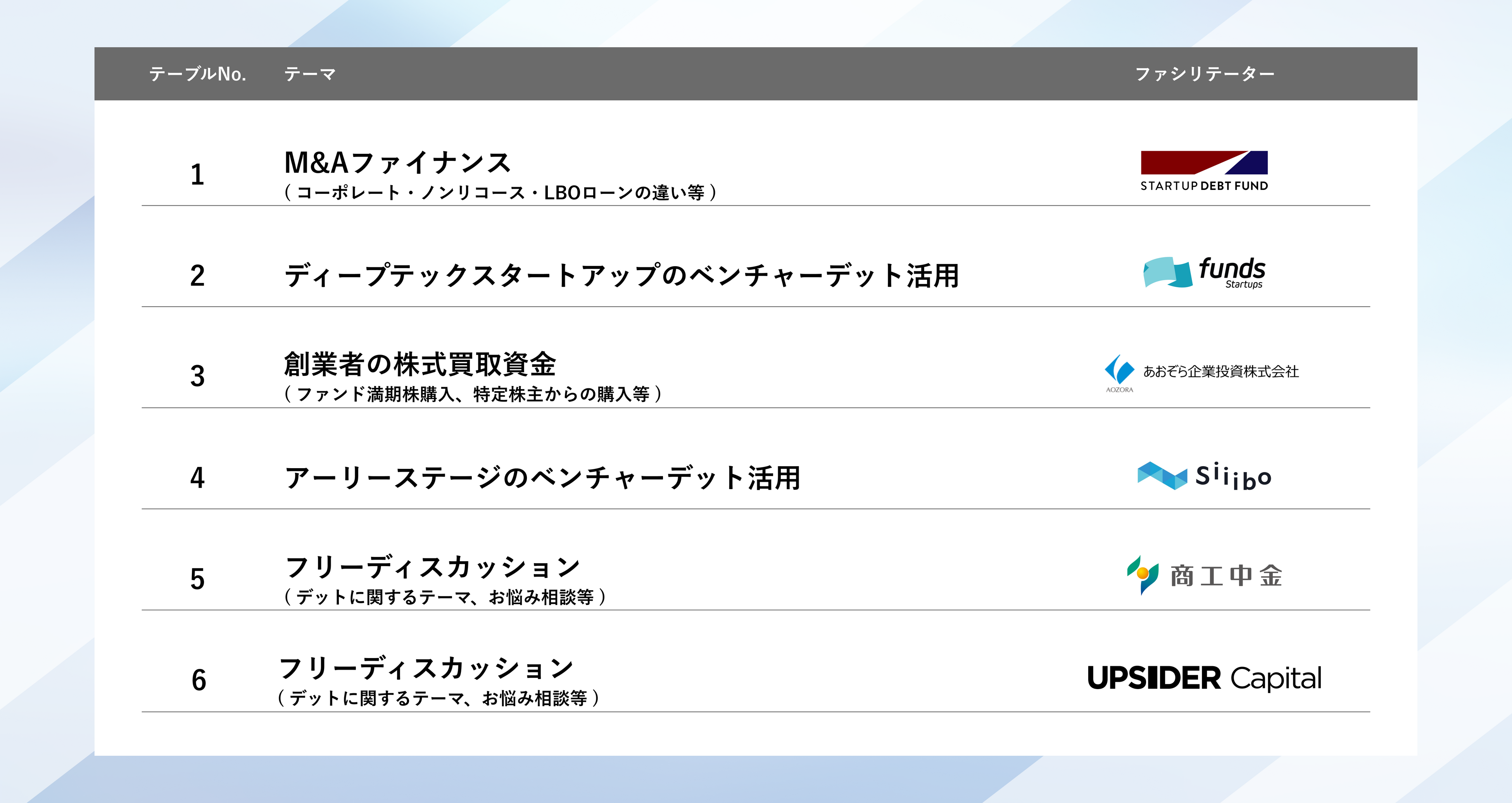 今回は「ベンチャーデットの真実と新潮流」をテーマとし、最新の活用事例や実務上の論点など実践に直結する知見を共有します。参加金融機関ラインナップを前回より拡大するほか、スタートアップと金融機関が直接意見交換できるラウンドテーブルを新たに導入。スタートアップの皆様により深く具体的な情報をお届けします。