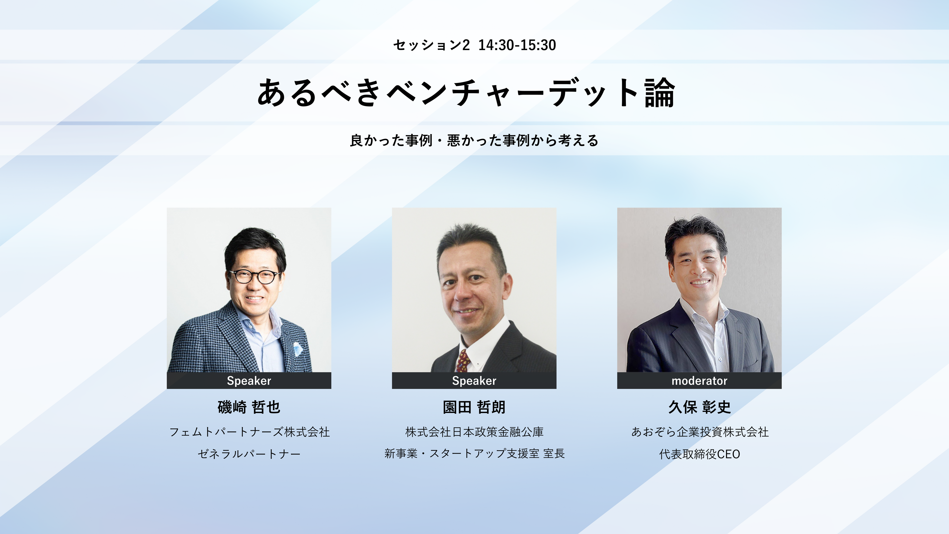 その役割・利用シーンが拡大しているベンチャーデットですが、本セッションでは、具体的に寄せられている”実際に利用してみてのポジティブ、ネガティブな声”を、スタートアップ、VC・株主、ベンチャーデットレンダーそれぞれの立場で掘り下げ、これからの”あるべきベンチャーデット”を展望します。
